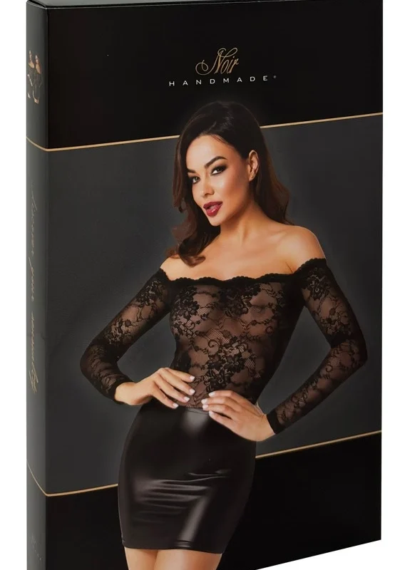 This striking black dress combines the timeless beauty of delicate lace with the contemporary appeal of powerwetlook fabric, offering a sophisticated look for special occasions or evening events. Designed with a flattering mini length, this model features long sleeves crafted from intricately patterned lace, creating a refined contrast to the smooth, sleek skirt section made from high-gloss powerwetlook material. The dress fits closely to the body, accentuating the silhouette while ensuring optimal comfort thanks to its soft, elastic materials.
