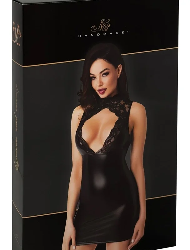 This sleeveless mini dress showcases a striking powerwetlook material in deep black, known for its subtle sheen and durable finish. The top section, including the sculpted cups and wide straps, is crafted from intricate, soft lace that gently frames the neckline, adding visual interest and an element of refined style. The lace is stretchable, ensuring a close, figure-hugging fit that remains comfortable throughout wear.