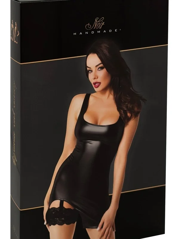 This meticulously crafted black mini dress features a sleek, powerwetlook finish for a bold visual effect, while maintaining comfort and flexibility thanks to its soft, stretchable material composition. The integrated suspender straps and delicately sewn lace garter details add a refined, fashionable accent, seamlessly enhancing your silhouette. Designed to fit closely to your body, the dress offers a flattering, anatomic cut that ensures both style and ease of movement.