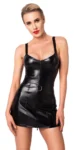 The dress includes a detachable belt with a striking decorative metal ring at the front, providing a bold, fashionable accent. The belt fastens securely at the back with a press stud for ease of use. Wide, adjustable shoulder straps allow for a customized fit, ensuring comfort with every wear. The black polymer-coated fabric provides a sophisticated shine and a luxurious feel, making this dress an exceptional choice for those seeking modern style and high-quality craftsmanship.