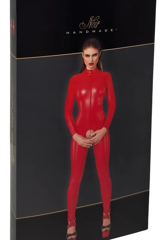 This sophisticated jumpsuit is crafted from a vivid red powerwetlook fabric, providing a contemporary and eye-catching appearance. Designed with a flattering silhouette, the model features a high stand-up collar, long sleeves, and full-length legs for a sleek, elongating effect. The soft, highly elastic material ensures an optimal, comfortable fit, adapting smoothly to your body’s contours.
