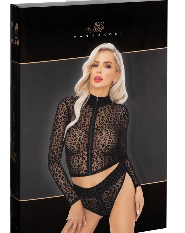 The Noir Handmade Top Leo XL is a modern, semi-transparent garment crafted from high-quality, soft mesh fabric, enhanced with a luxurious velvet flock print in a distinctive leopard pattern. This top is designed to combine comfort with striking aesthetics, featuring a full-length front zip and a stylish stand-up collar for added elegance.