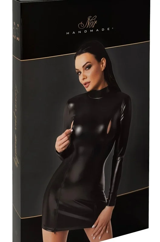 Discover the refined elegance of the Noir Orgia Exclusive Long Sleeve Dress in size L, meticulously crafted from advanced black powerwetlook material. This sophisticated model features a high neckline and a sleek, body-contouring silhouette designed for confident, modern styling. The innovative construction incorporates two full-length, two-way zips over the front, running from the collar to the hem, allowing for versatile customization and a contemporary aesthetic.