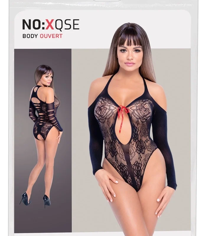 Discover the NO:XQSE Lace Body with 3/4 sleeves, designed for a striking and modern look. This body features a sophisticated lace pattern with enticing openwork details and shoulder cut-outs, creating an eye-catching silhouette. The deep neckline is elegantly accentuated with a single decorative red bow that can be untied, adding a unique visual element to the front.