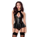 Obsessive 859-COR-1 Wet Look Corset & Thong Set L/XL Black is a sophisticated addition to your wardrobe, designed for those who appreciate modern style and high-quality materials. This model from the renowned Obsessive brand features a contemporary ‘wet look’ fabric combined with delicate mesh adorned with a subtle pattern, creating a visually captivating effect. The halter neck design with adjustable fastening ensures a tailored fit, while the elegant flared bottom and refined lacing at the back add a touch of glamour.