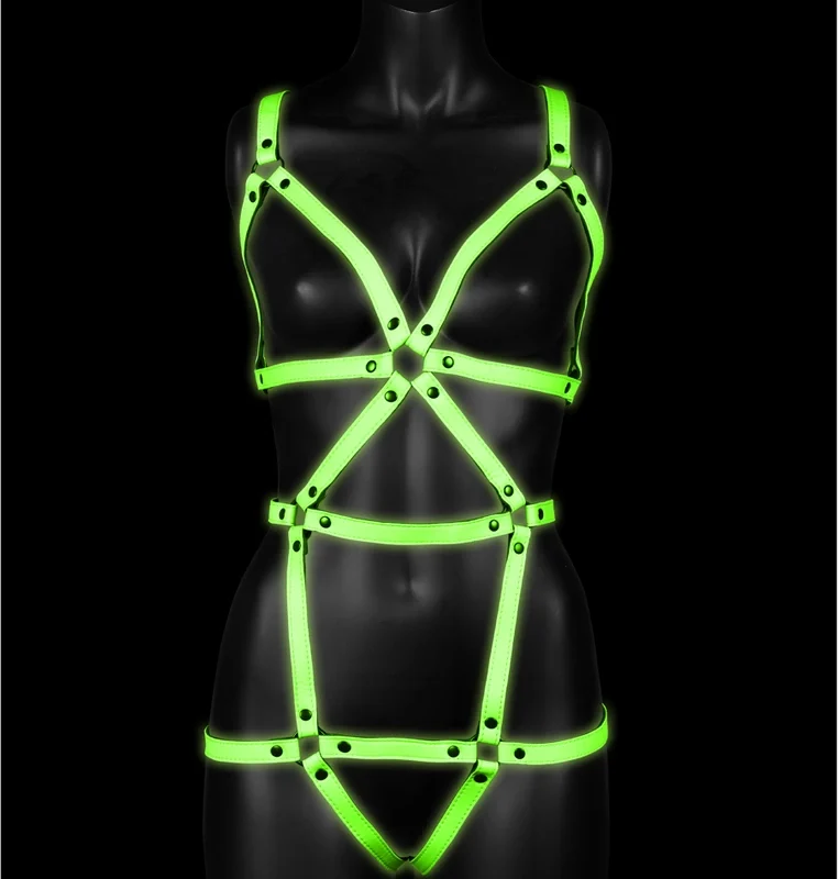 The harness is constructed from high-quality, durable materials that provide both strength and flexibility. Its adjustable straps allow for a custom fit, accommodating various body shapes and sizes within the S/M range. The bright fluorescent green detailing creates a striking contrast, while the glowing effect adds a futuristic touch to your ensemble. Easy to put on and remove, this harness is designed for convenience and long-lasting use.