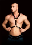 Enhance your style with the Ouch! Thanos Chest Centerpiece Harness, designed for those who appreciate both aesthetic impact and functional comfort. Crafted from robust, high-quality black PU leather, this harness stands out thanks to its striking central O-ring, reinforced with durable metallic rivets for extra strength and distinctive appearance.