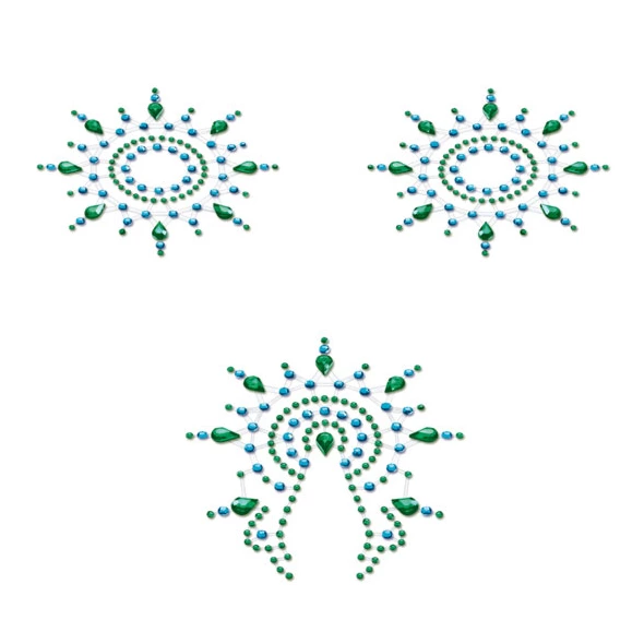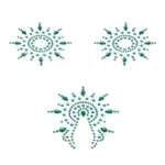 Petits Joujoux Gloria Body Jewelry Set Turquoise & Green Crystal is an exquisite set of decorative jewelry designed to enhance the body with a touch of glamour and sophistication. This elegant model features over 300 high-quality, sparkling crystals in stunning turquoise and green hues, arranged to create an eye-catching, luxurious accessory.