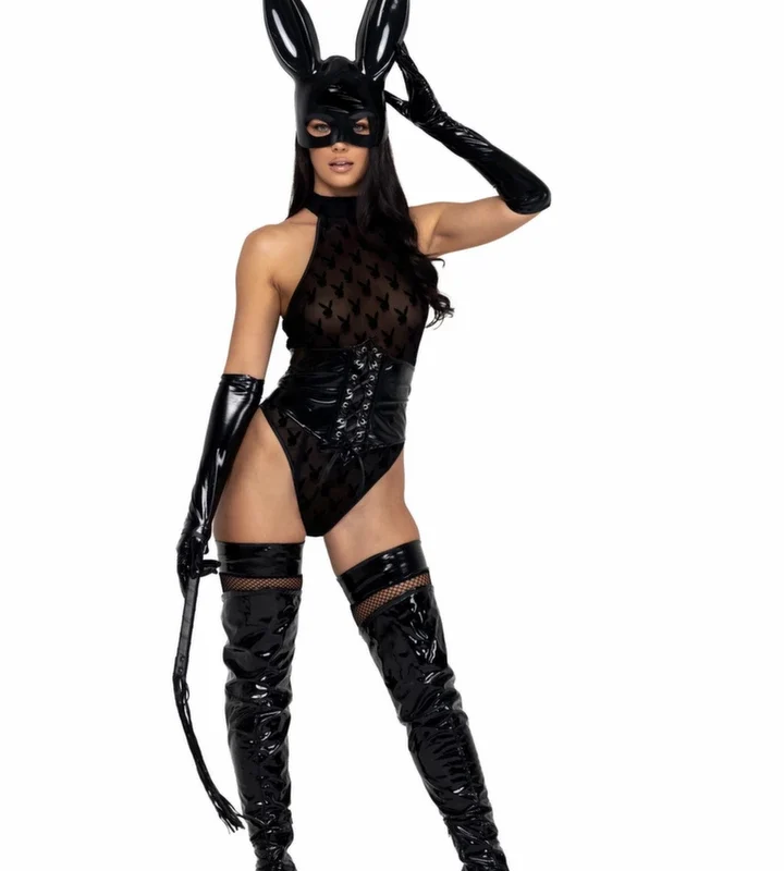 • Set includes: sheer bodysuit, vinyl lace-up waist belt, Bunny ears headband