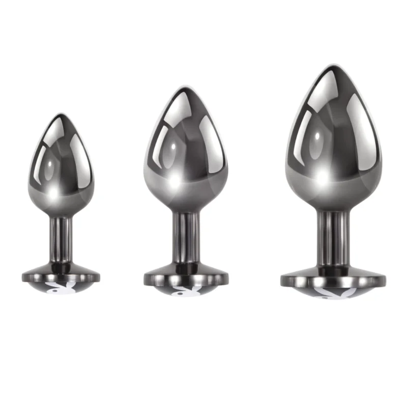 Discover versatility and precision with the Playboy Pleasure 3-Piece Hematite Anal Plug Set. This expertly crafted set offers three distinct sizes, allowing for gradual and comfortable exploration at your own pace. Each plug is engineered from premium, body-safe aluminum alloy and finished with a hematite-plated surface, ensuring durability, easy cleaning, and a sleek, modern appearance.