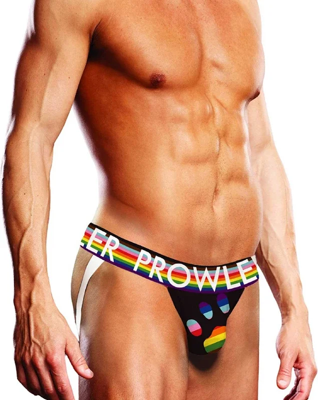 Experience a unique combination of style, comfort, and support with the Prowler Oversized Paw Jockstrap in classic black. Designed for those who value both functionality and eye-catching details, this model features a robust waistband accented with the colors of the Progress Pride flag, making it a standout addition to your wardrobe. The signature Prowler paw print is prominently displayed at the front, also in vibrant Pride colors, expressing individuality and inclusivity.