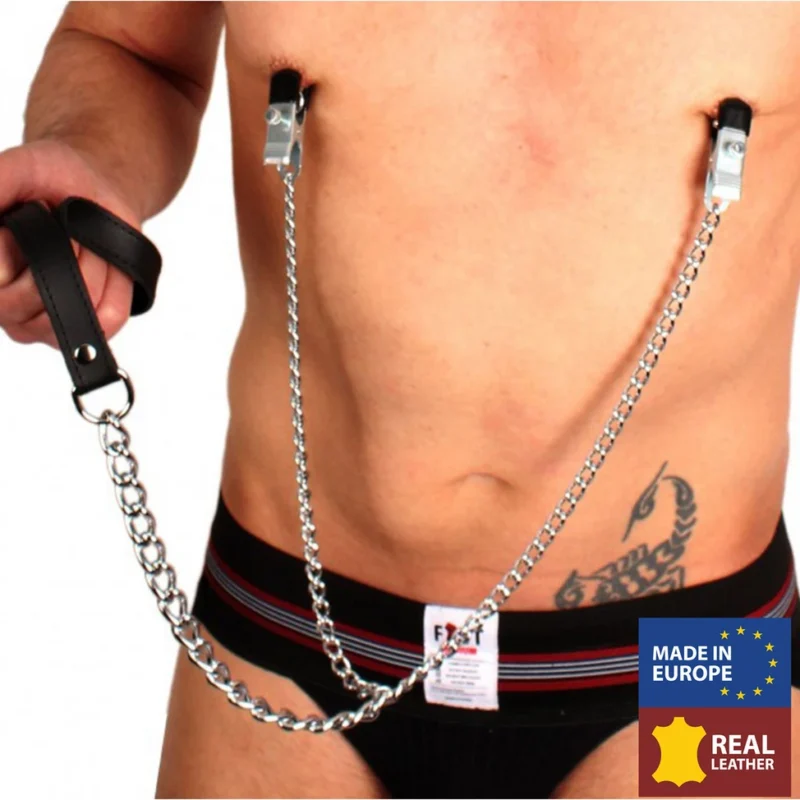 This sophisticated set is expertly crafted in Europe from high-quality, vegetable-tanned leather and features a durable metal chain measuring a total of 55 cm. The adjustable clamps offer a personalized fit, while the robust chain and detachable leash introduce an element of stylish versatility. The premium leather is not only visually striking but also ensures lasting durability and comfort.