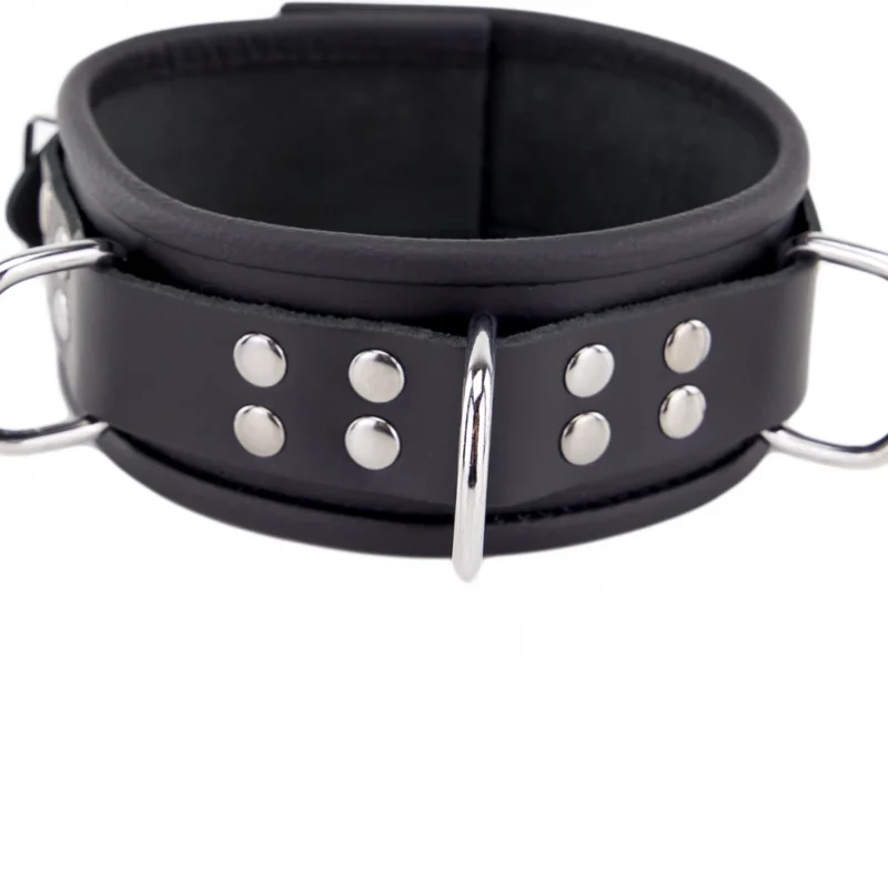 The collar is equipped with three robust D-shaped metal rings, securely fixed with reinforced metal rivets, offering versatile functionality and a distinctive aesthetic. Its adjustable design accommodates neck sizes from 38 to 53 cm, providing a secure and customizable fit for various preferences.