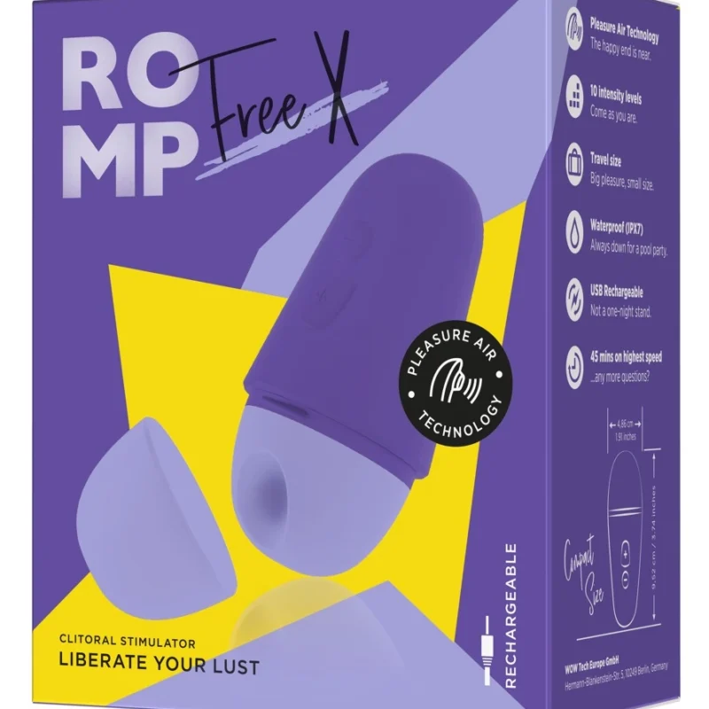 Discover the advanced ROMP Free X – a compact, travel-ready personal care device designed with innovative Pleasure Air Technology. This model utilizes pulsating air waves to deliver targeted, contactless stimulation, allowing for an experience that is gentle yet effective thanks to its 10 adjustable intensity settings. The ergonomic and lightweight design ensures effortless handling, making it suitable for both home use and journeys.