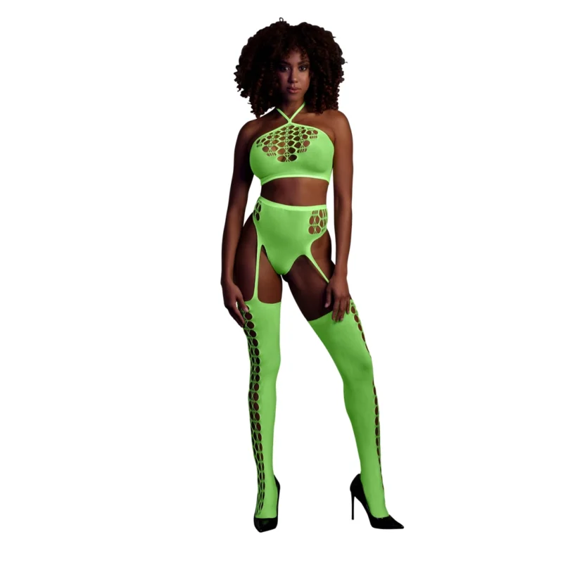The easy-to-wear design is complemented by seamless integration between the top and the stockings, creating a cohesive and fashionable ensemble. The UV-reactive fabric not only adds a striking visual effect but also introduces a captivating dimension to your outfit, perfect for events under blacklight or club settings.