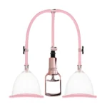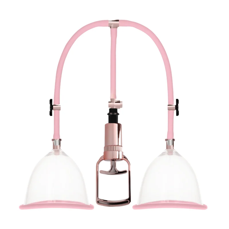 The system features two anatomically contoured cups crafted from durable, body-safe acrylic with a soft silicone seal for a gentle, secure fit. The silicone edges ensure a comfortable experience by preventing air or moisture leakage during use. The included manual hand pump with an integrated hose allows for precise control of the vacuum level, ensuring individualized adjustment to user preferences.
