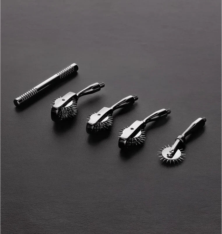 SINNER GEAR Interchangeable Pinwheel Set Chrome 4 Attachments is a versatile and innovative tool designed for those who appreciate advanced tactile stimulation and precise sensory play. Engineered with high-quality chrome-plated metal, this set features a robust, ergonomic handle and four interchangeable pinwheel attachments, each offering a unique distribution and number of heads for a customizable experience.