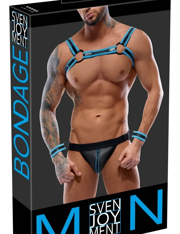 Experience a unique and modern design with the Svenjoyment BONDAGE Men’s Harness Set in black and royal blue, size S. The set is crafted to combine a striking neoprene-look finish with functional details, offering a bold visual effect and reliable performance. This comprehensive package includes a chest harness, jock-style underwear, and two adjustable hand restraints for versatile use.
