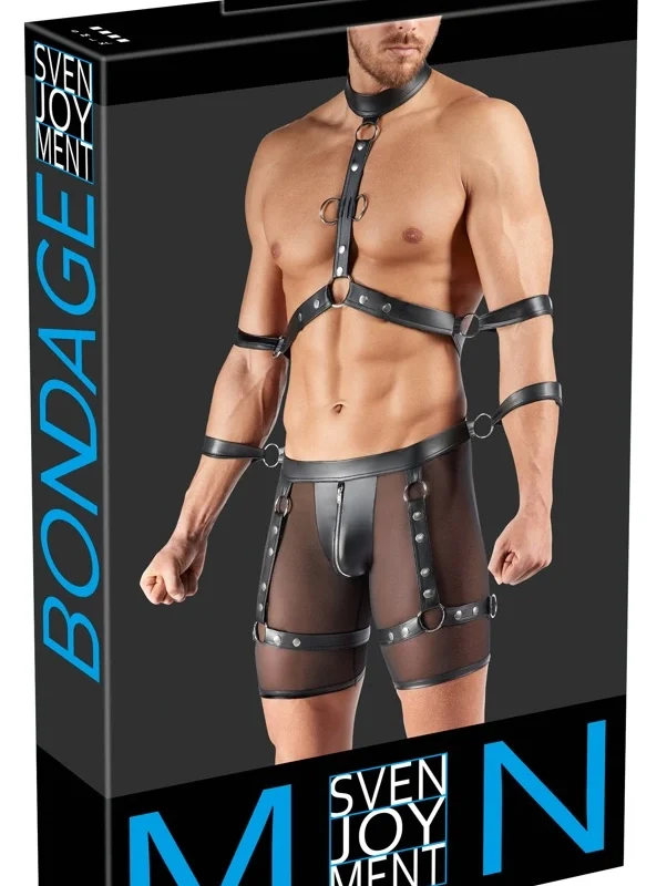 Upgrade your style and confidence with this advanced harness set designed by Svenjoyment, renowned for their innovative approach to fashion accessories for men. This complete black set combines a pair of sleek powernet shorts, a chest harness, and four versatile wrist or arm restraints. Crafted for both comfort and a striking visual impact, the set is ideal for those seeking a unique and bold look.
