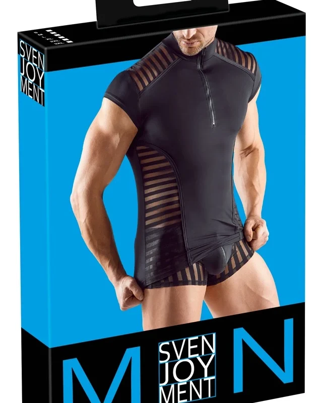 The shirt features anatomic tailoring and short sleeves, ensuring freedom of movement and a flattering silhouette. Crafted from exceptionally soft black microfibre, it combines a luxurious feel with practical stretch for optimal fit. Transparent stripe inserts, elegantly placed at the sides and across the shoulders, add a striking visual element while maintaining a refined look. The stand-up collar adds a touch of distinction, complemented by a short, practical front zip for easy wear.