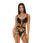 - Set Includes: Embossed cheetah print bustier with strappy details and attached garter straps, plus a matching panty