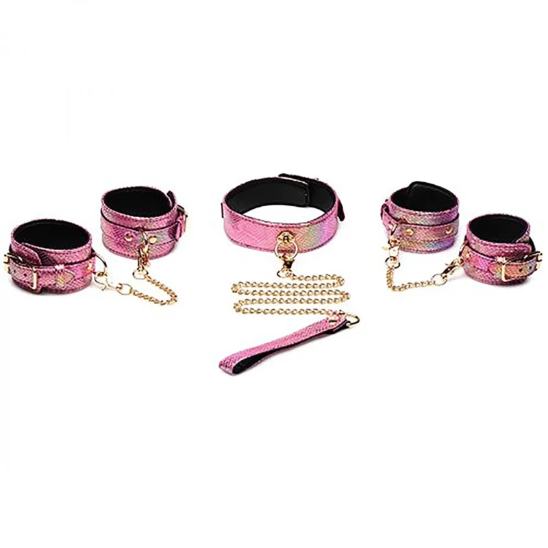 XR Brands Captive Cobra Pink Snake Print Bondage Set is a sophisticated collection of accessories designed for those who value both style and function. This model stands out thanks to its elegant pink color, iridescent rainbow sheen, and distinctive snake print pattern, delivering a unique visual effect during use. The set is made from high-quality, vegan-friendly polyurethane (PU) leather, ensuring both comfort and durability while remaining cruelty-free.